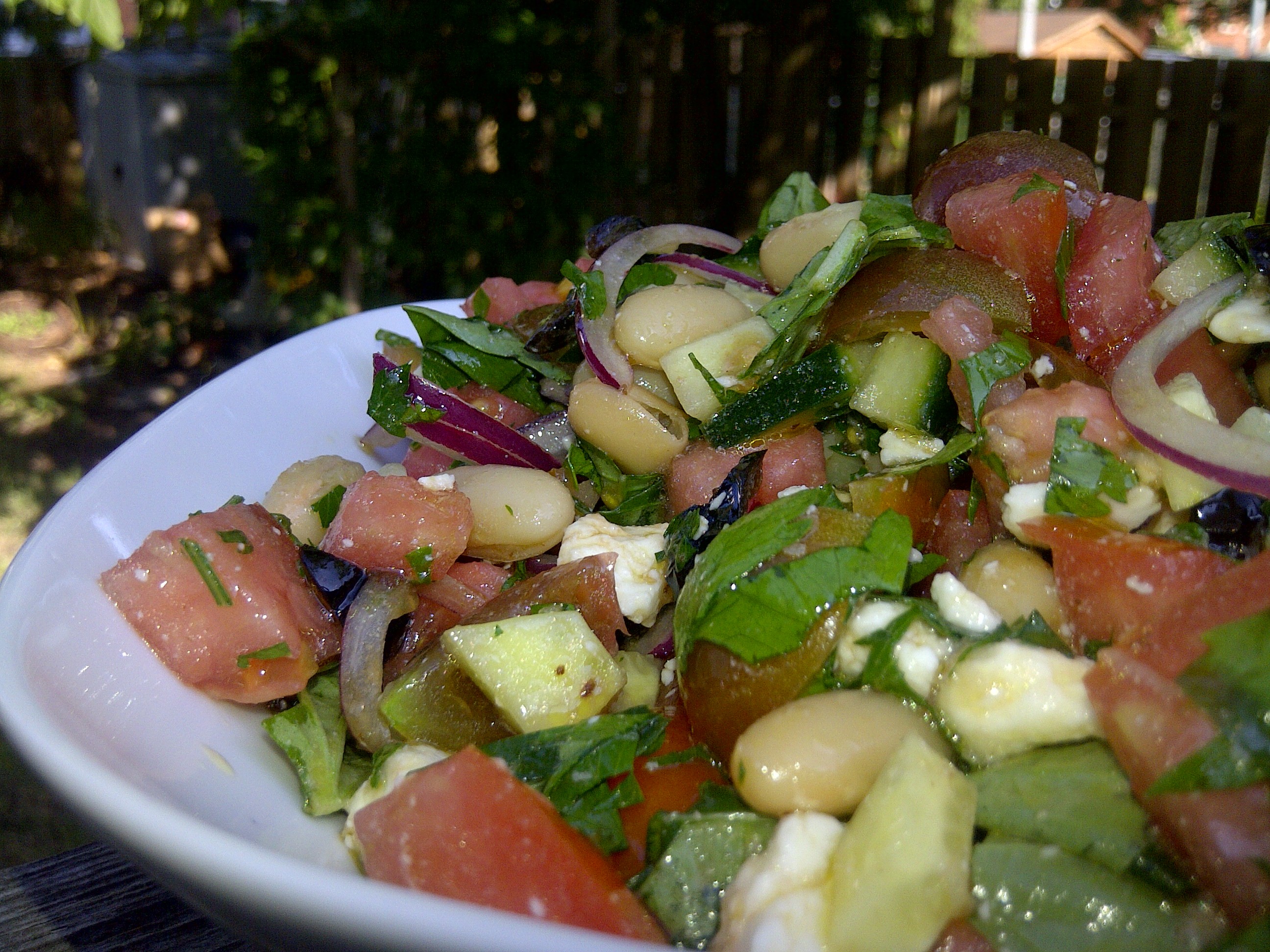 2. To make the salad combine the tomatoes, onion, basil, parsley, cucumbers, white kidney beans, olives, feta cheese and the vinaigrette in a large bowl. Toss well and season with salt and pepper.